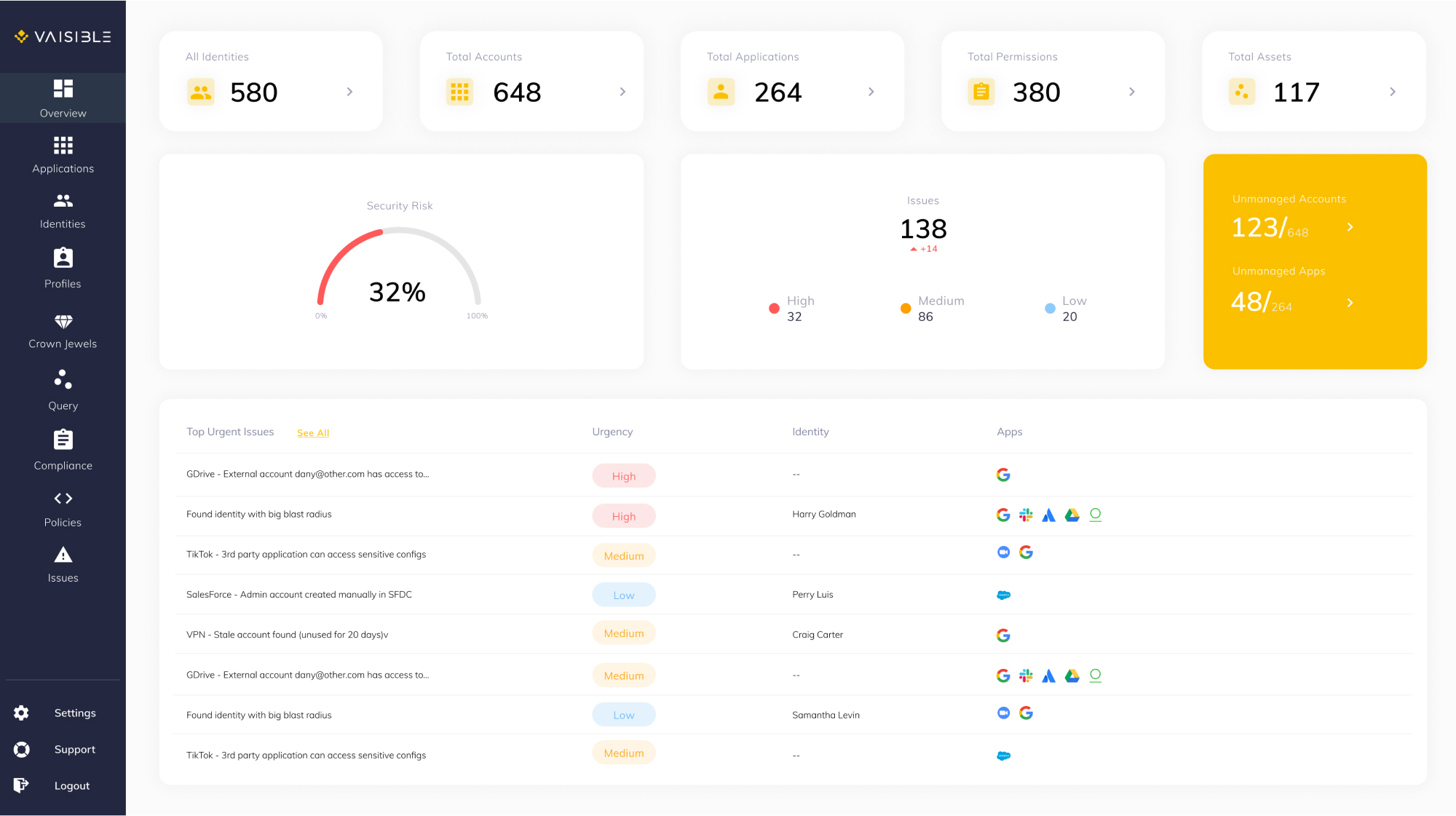 • Track discovered apps, sensitive access and misconfigurations